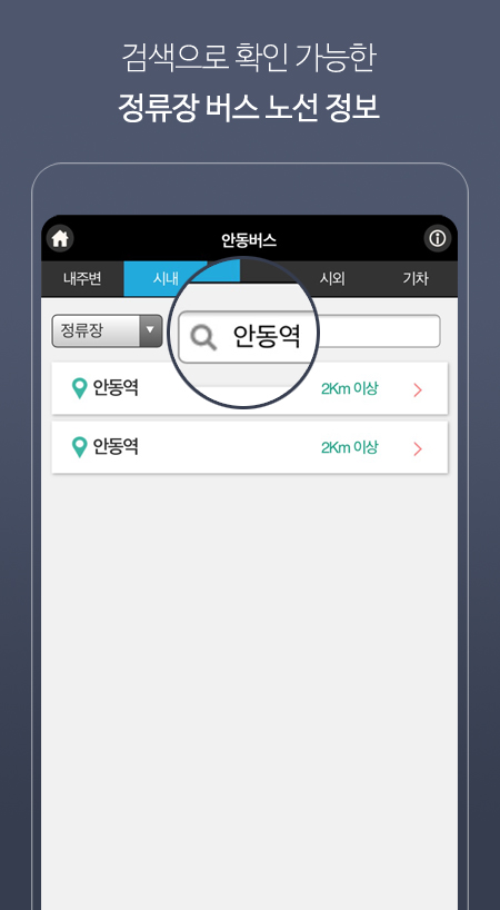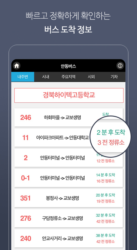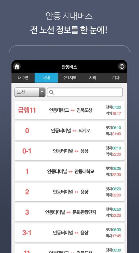1. 현재 운행중인 안동 시내버스 전 노선 검색가능(도착정보없음 노선은 비노출)