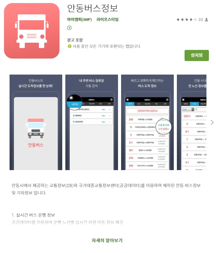 안드로이드 안동버스정보 앱은 안동시에서 제공하는 교통정보(DB)와 국가대중교통정보센터(공공데이터)를 이용하여 지역 개발업체 IMP(아이엠피)에서 개발하였으며 구글 플레이스토어에서 다운받아 무료로 사용하실 수 있습니다.
