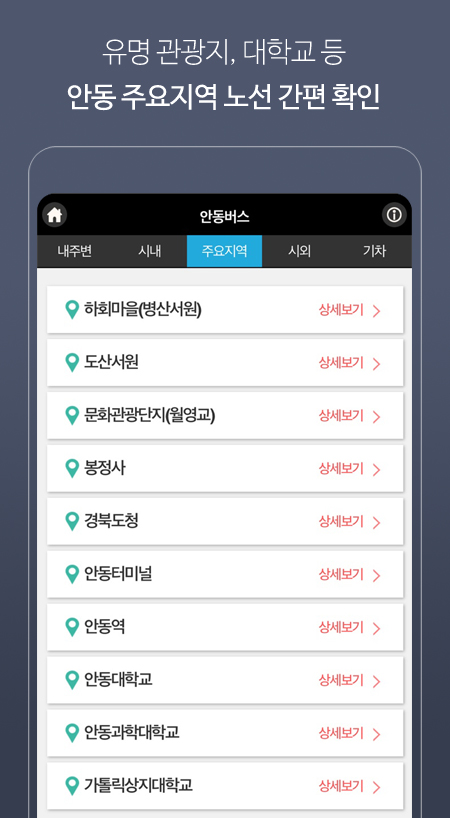 안동 주요 관광지 및 대학 정류장 모아보기