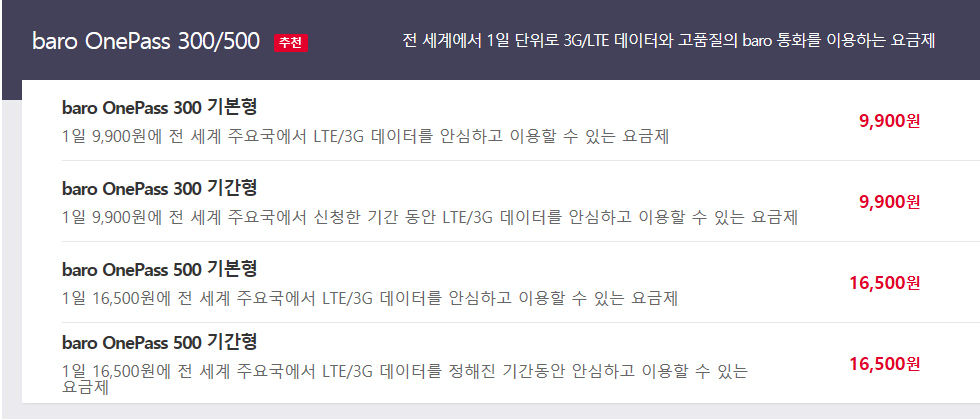 데이터 3G 29,000원(7일 유효)/데이터4G 39,000원(30일 유효)/데이터7G 59,000원(30일 유효)