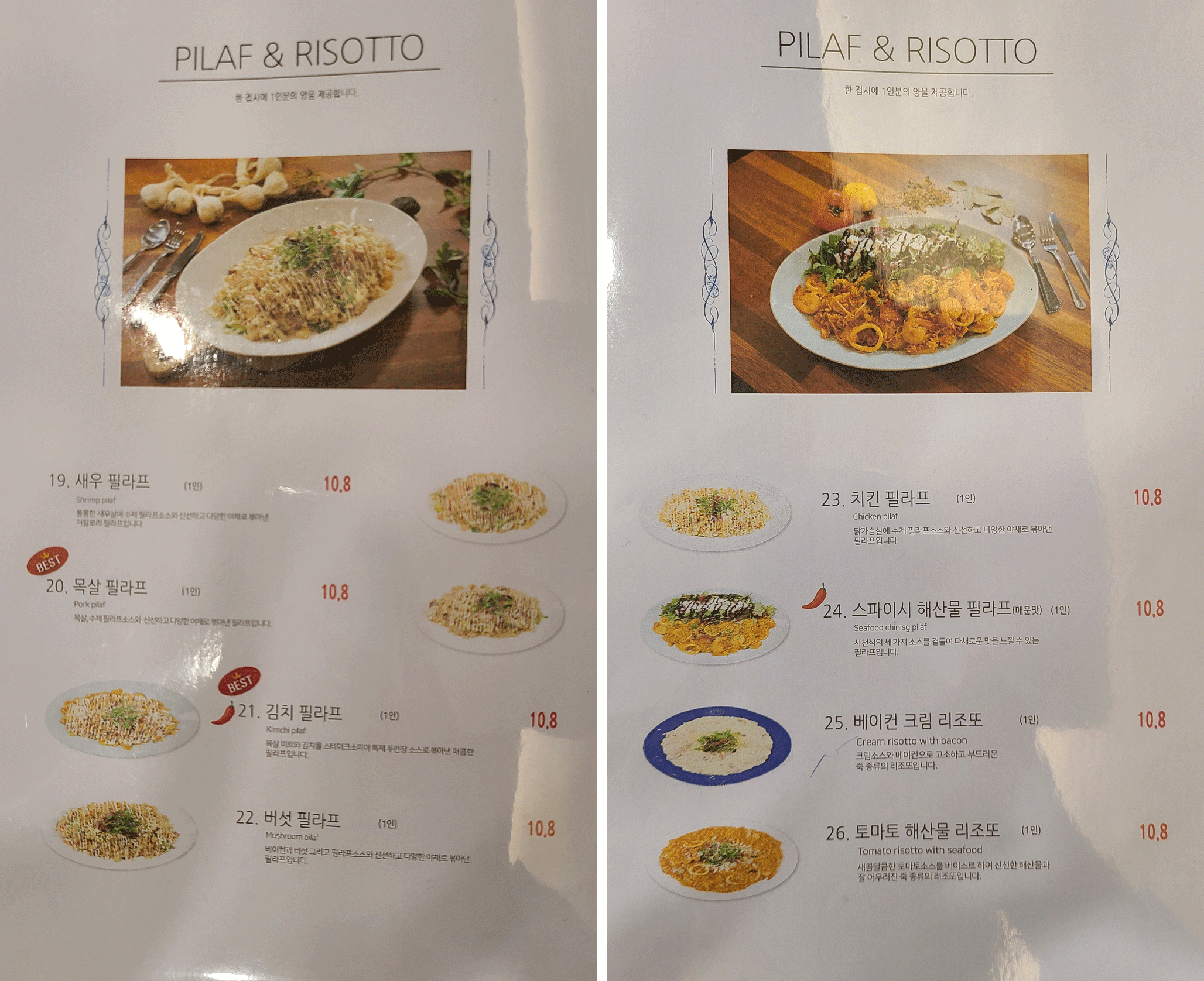스테이크, 파스타, 피자, 리조또 등 메뉴 있어요