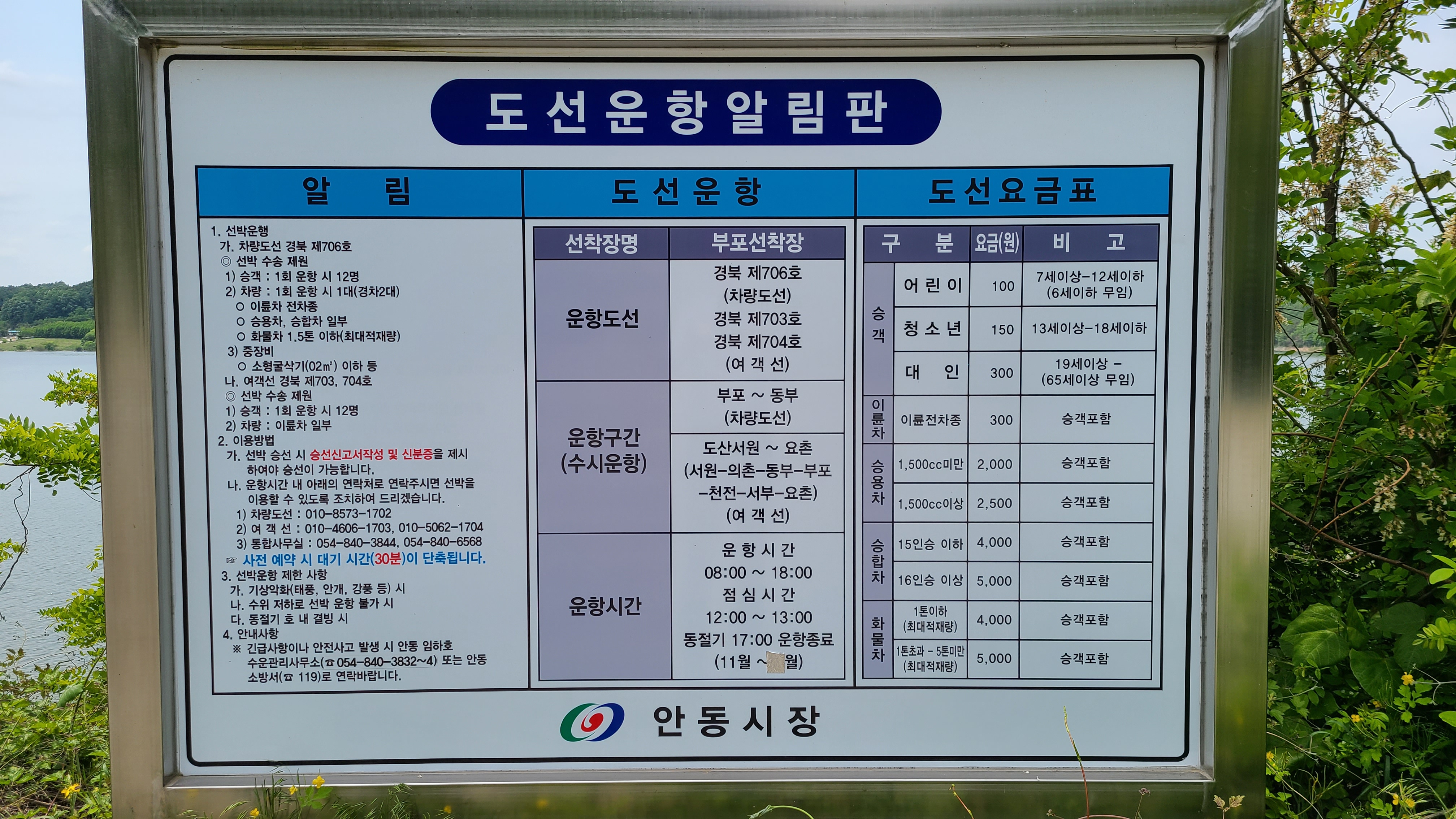 갈 때와 같이 안동댐을 빙 돌아가는 우회도로를 이용할 수도 있지만 좀 더 빠르고 편한 방법은 안동호를 가로지르는 배를 타는 것이다.