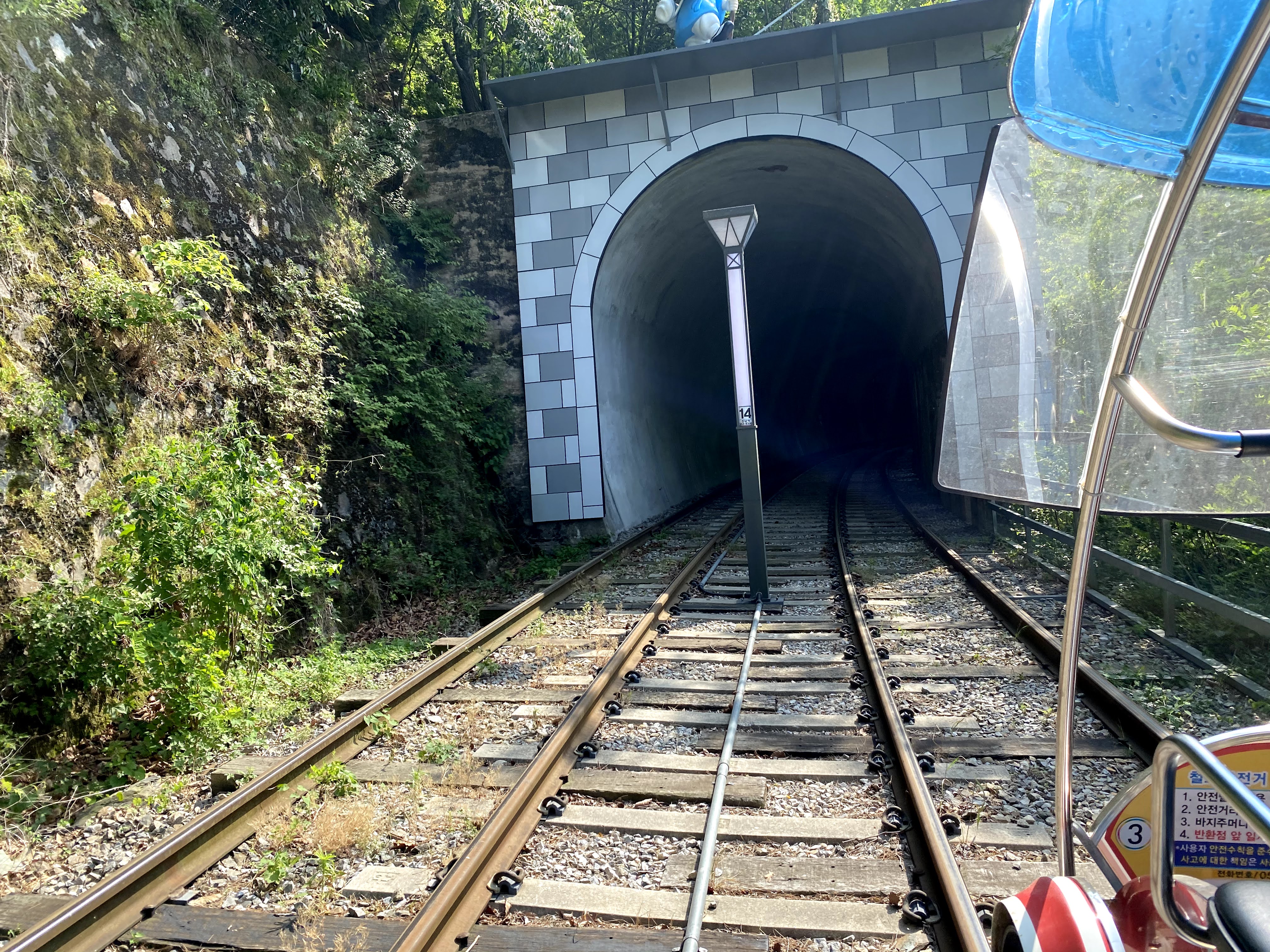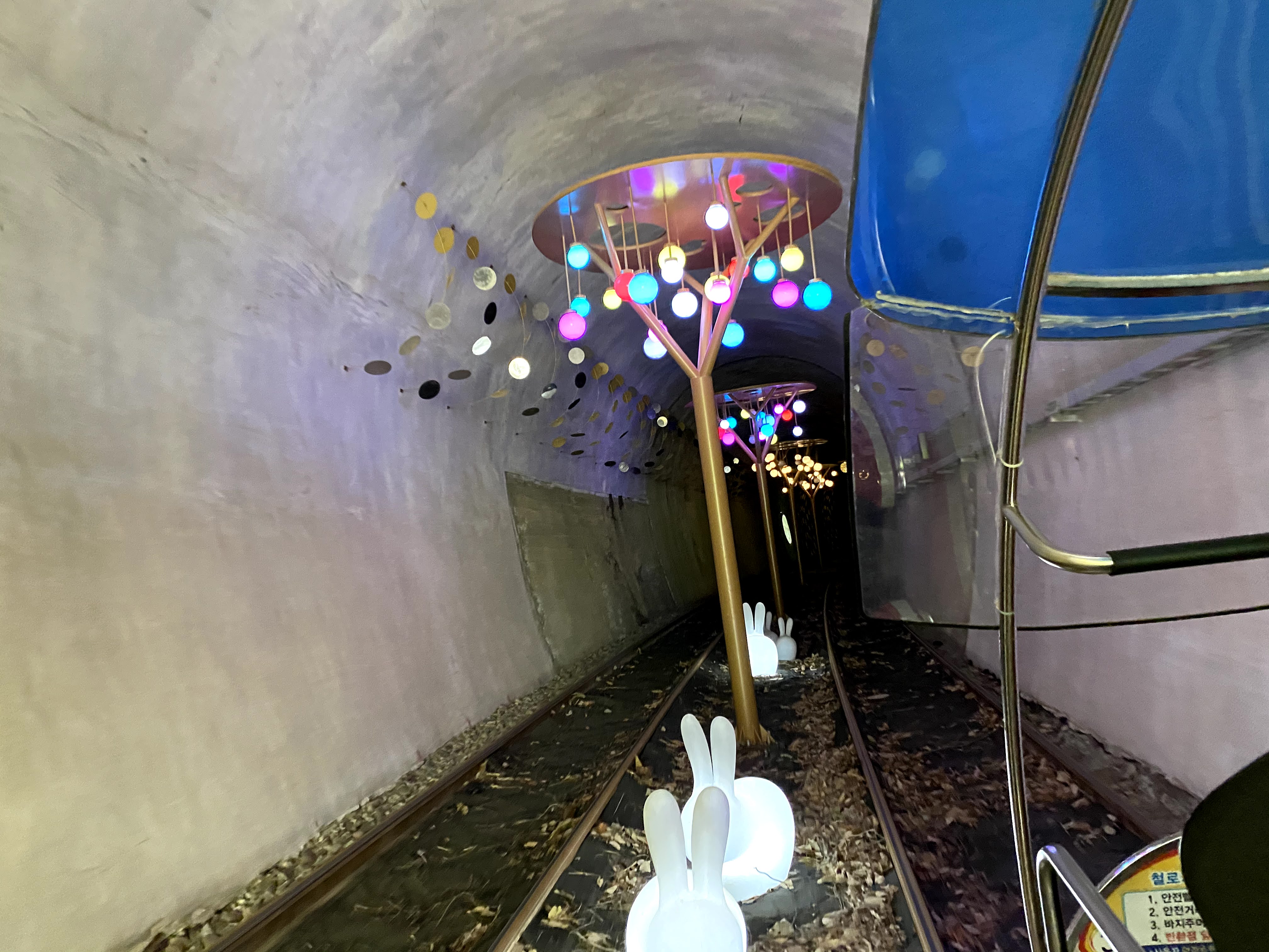 진남역 코스에 터널이 2개가 있는데 첫번째 어두운 터널은 각종 야생동물 소리와 음악소리가 나오고 색색깔 조명으로 장식도 해 놓았다.