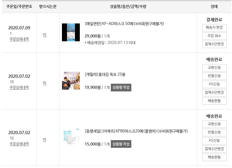 7월2일 아에르KF80라이트핏 20장과 KF80 20장을 구매하였으며 7월3일 비말차단KF-AD50장(의료용마스크형태)를 구매하였다