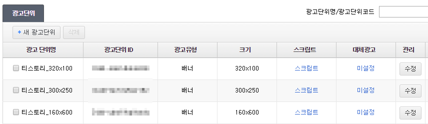 티스토리 상단 광고는 250x250와 728x90, 하단 광고는 728x90 , 사이드바 광고는 160x160 크기를 넣을 수 있으므로 동일한 순서로 광고 크기에 따라 필요한 개수만큼 만들어서 적용하면 된다.