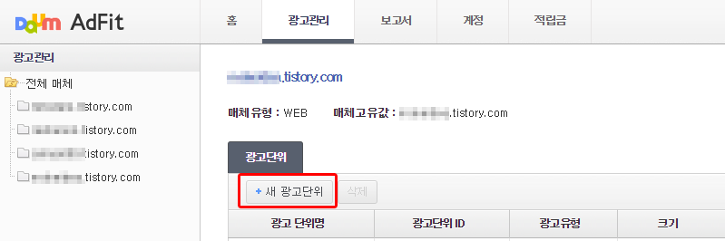 전체 매체에서 바로 전 추가한 매체명을 클릭한 다음 새 광고 단위를 선택해서 광고단위 ID를 만들도록 한다.