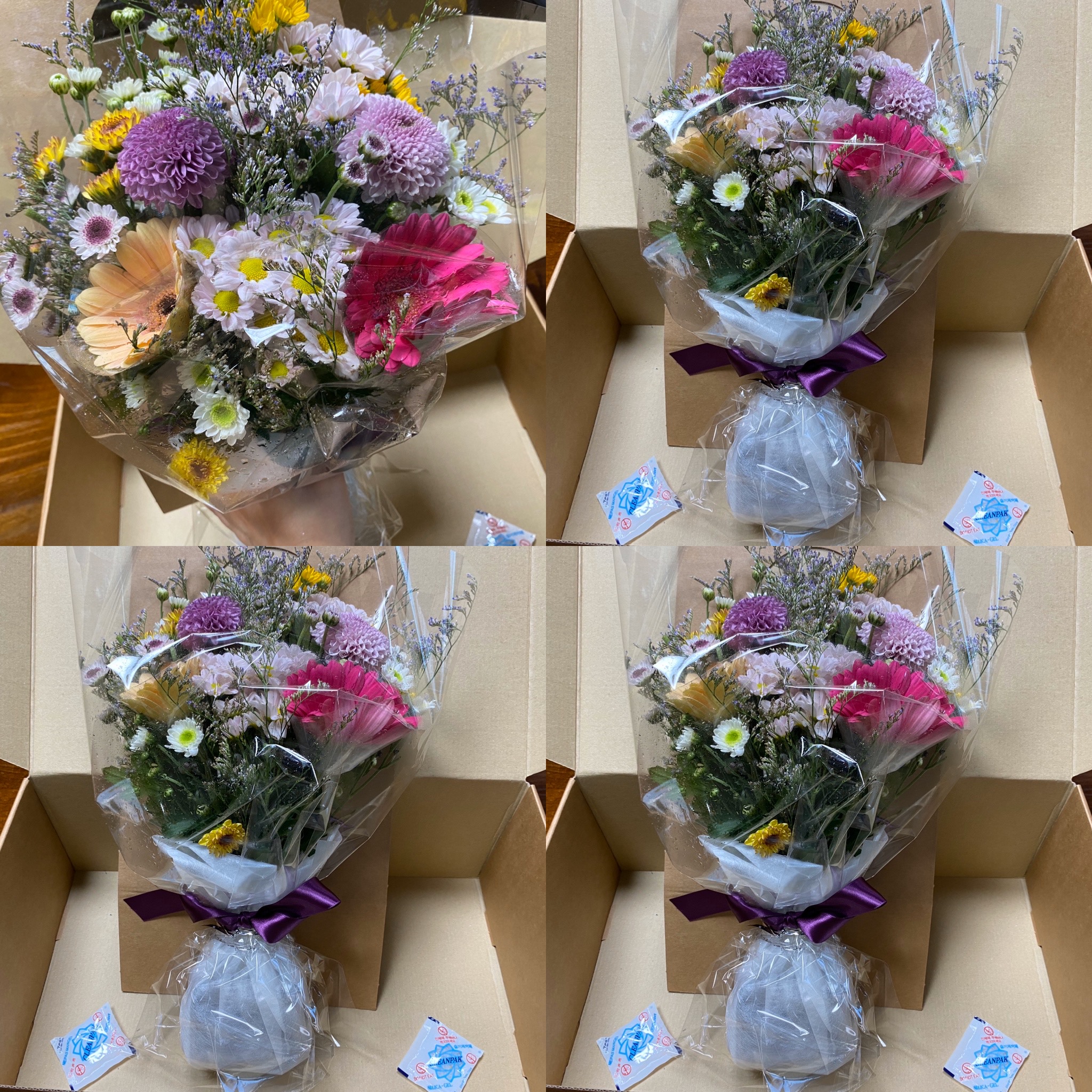 꽃다발이 어떻게 택배로 배송될까? 은박보온재 포장 조금도 흐트러지지 않고 오아시스에 꽂아 움직이지 않게 상자로 고정되어 예쁘게 배송되었다.