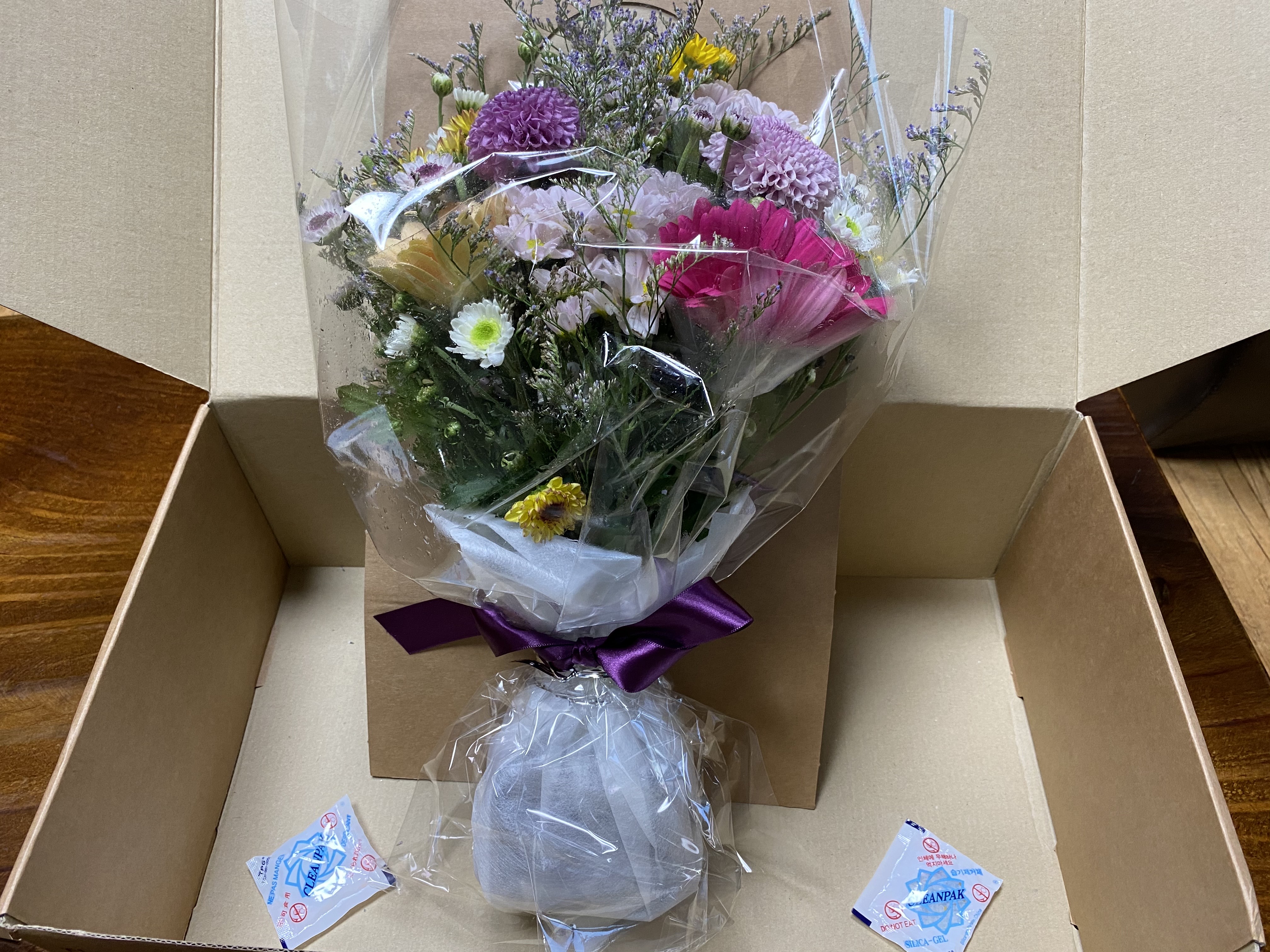꽃다발이 어떻게 택배로 배송될까? 은박보온재 포장 조금도 흐트러지지 않고 오아시스에 꽂아 움직이지 않게 상자로 고정되어 예쁘게 배송되었다.