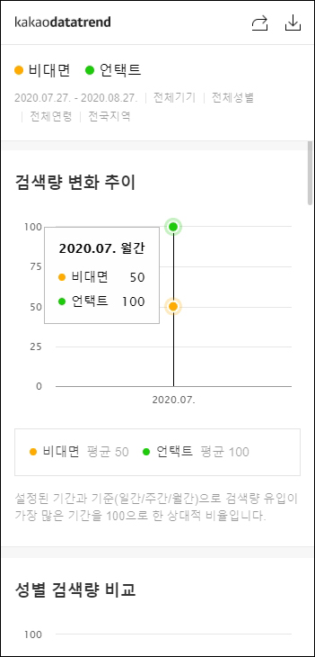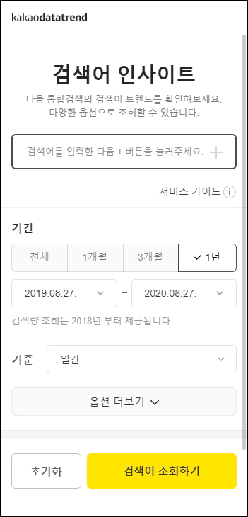 포털사이트 다음의 통합 검색어 정보를 분석하는 것으로 기간, 기기, 성별, 연령, 지역 정보를 검색어 최대 5개까지 비교 분석 할 수 있고, 차트 형태로 직관적으로 확인이 가능하다.