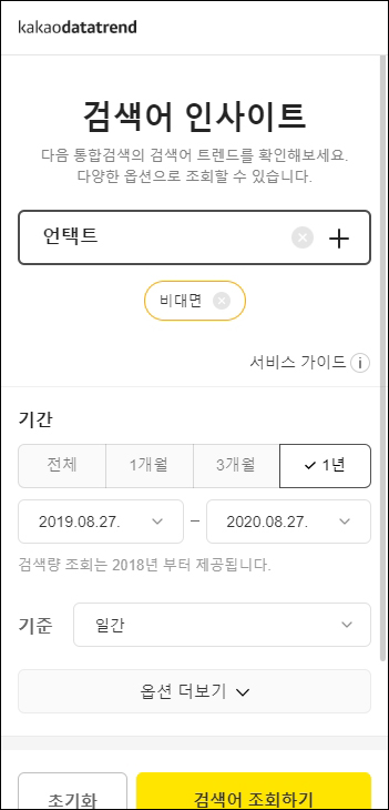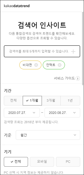 예로, 요즘 흔히들 쓰는 비대면, 언택트 2개의 키워드를 입력해 비교 분석해보자.