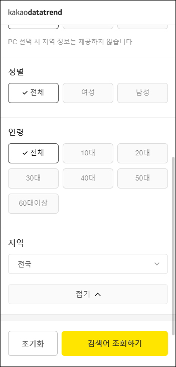 기간은 최근 1개월, 성별과 연령은 전체, 지역은 전국을 선택 후 검색어를 조회하였다.