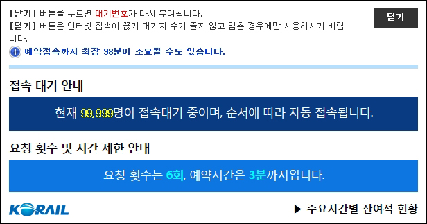 5. 접속 대기시 인터넷이 끊긴 상태가 아니라면 [닫기] 버튼 클릭 금지. 대기 인원이 줄어들 때 까지 차분하게 기다리자.