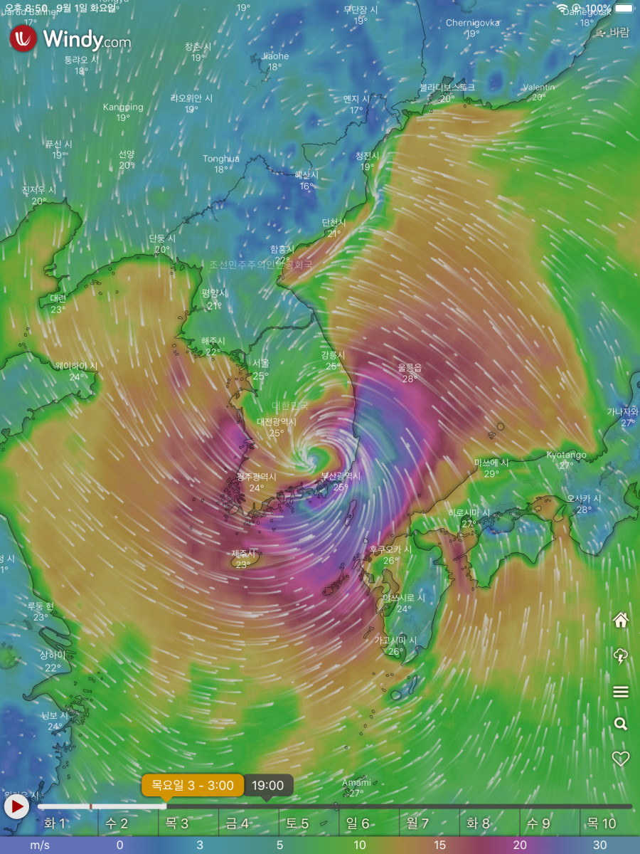 윈디는 내일, 9월 2일부터 영향권에 들어가서 9월 3일 영남지방을 관통해서 한반도를 빠져 나가는 것으로 예측했다.