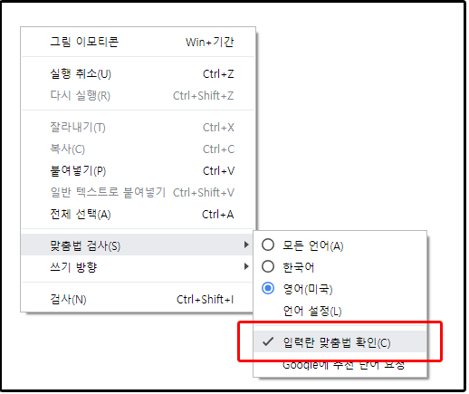 설정 방법은 입력 텍스트 입력창에서 오른쪽 마우스를 클릭한 다음 [맞춤법 검사] - [입력란 맞춤법 확인] 을 해제하면 된다.