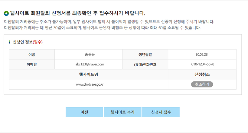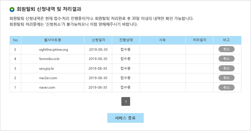 신청한 웹사이트 회원탈퇴는 처리완료 후 해당 계정정보가 복구가 되지 않으니 신중하게 검토하신 후에 신청해 주세요.
