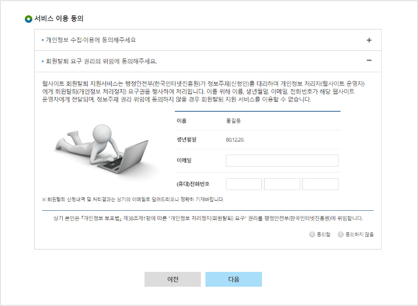 e프라이버시 클린서비스에서 제공하는 '웹사이트 회원탈퇴 처리지원' 서비스 이용을 위한 개인정보 수집 이용에 동의가 필요합니다.