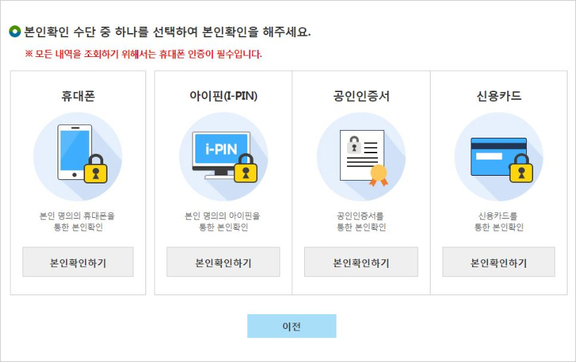 휴대폰, 아이핀, 공인인증서, 신용카드 중 하나를 선택하여 본인확인을 해주세요.