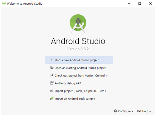 실행 첫 화면이 나오면 Configure 에서 SDK Manager를 선택하면 설치되어 있는 안드로이드 버전을 확인할 수 있으며 이후 개발에 필요한 버전과 Tool 등을 설치할 수 있다.