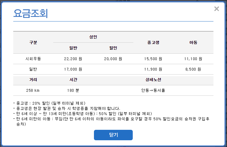 동서울 종합터미널(강변역)에서 경북 안동터미널(안동시외버스터미널) 가는 시외버스 정보입니다.