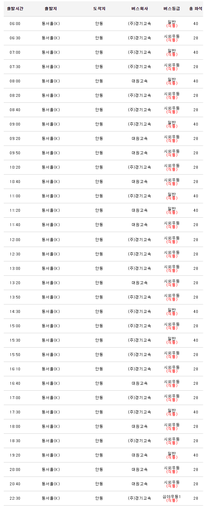 출발 시간별로 버스회사와 버스 등급, 총좌석은 아래 표를 참고하면 됩니다.