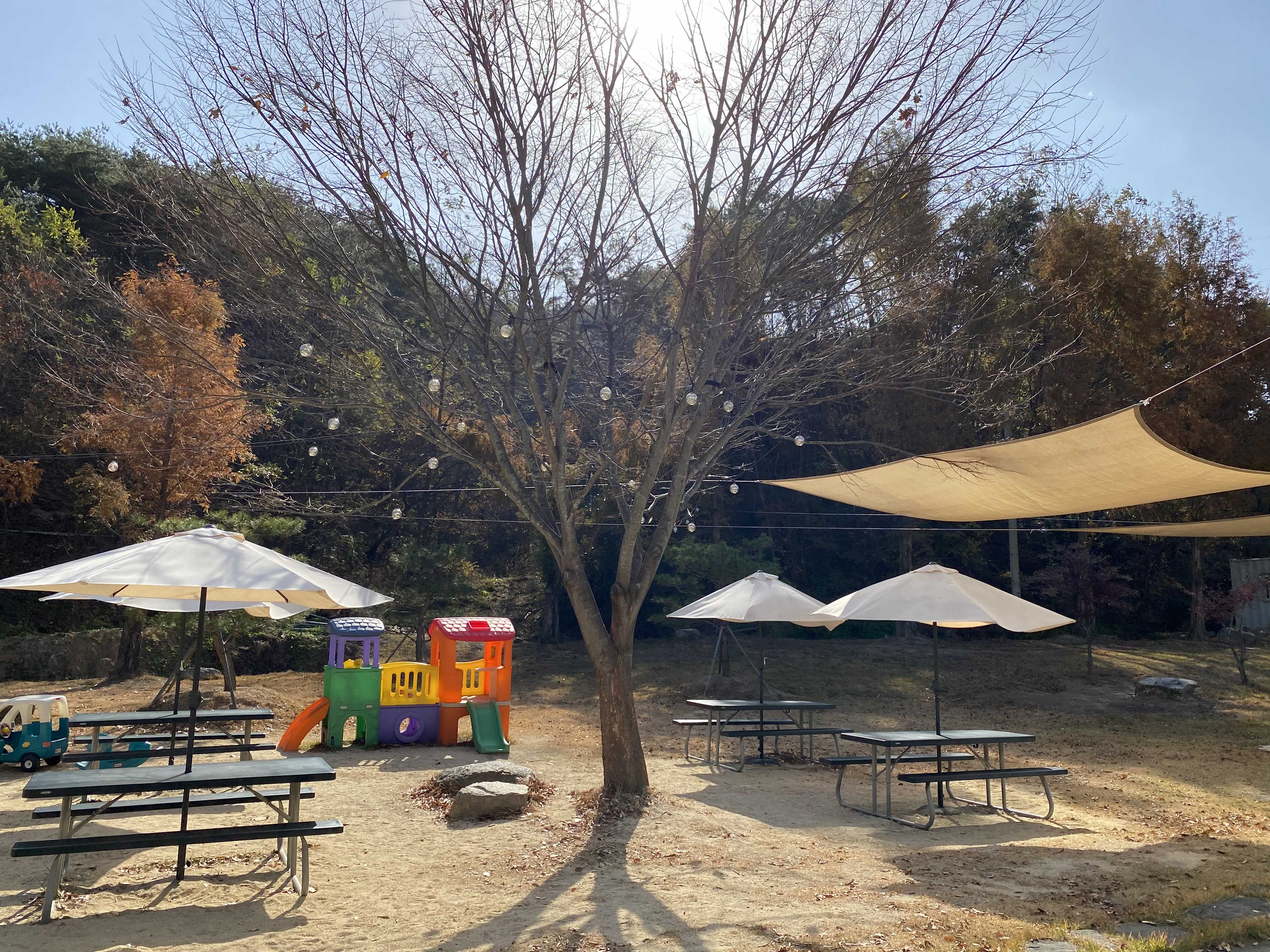 위가 뚫린 텐트 안에서 바베큐를 하셨다.