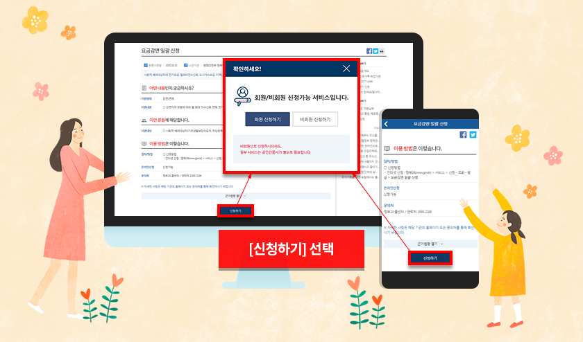 요금감면 일괄 신청 안내 화면에서 <신청하기>를 선택하고, <회원신청하기> 또는 <비회원 신청하기>를 선택하여 로그인을 합니다.