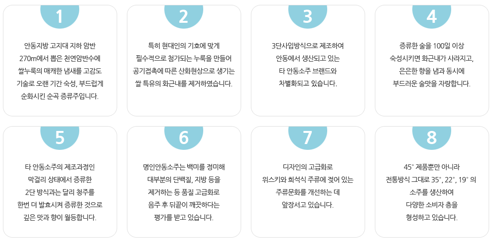 명인 소주의 특징을 명인 안동소주 홈페이지에서도 확인할 수 있습니다.