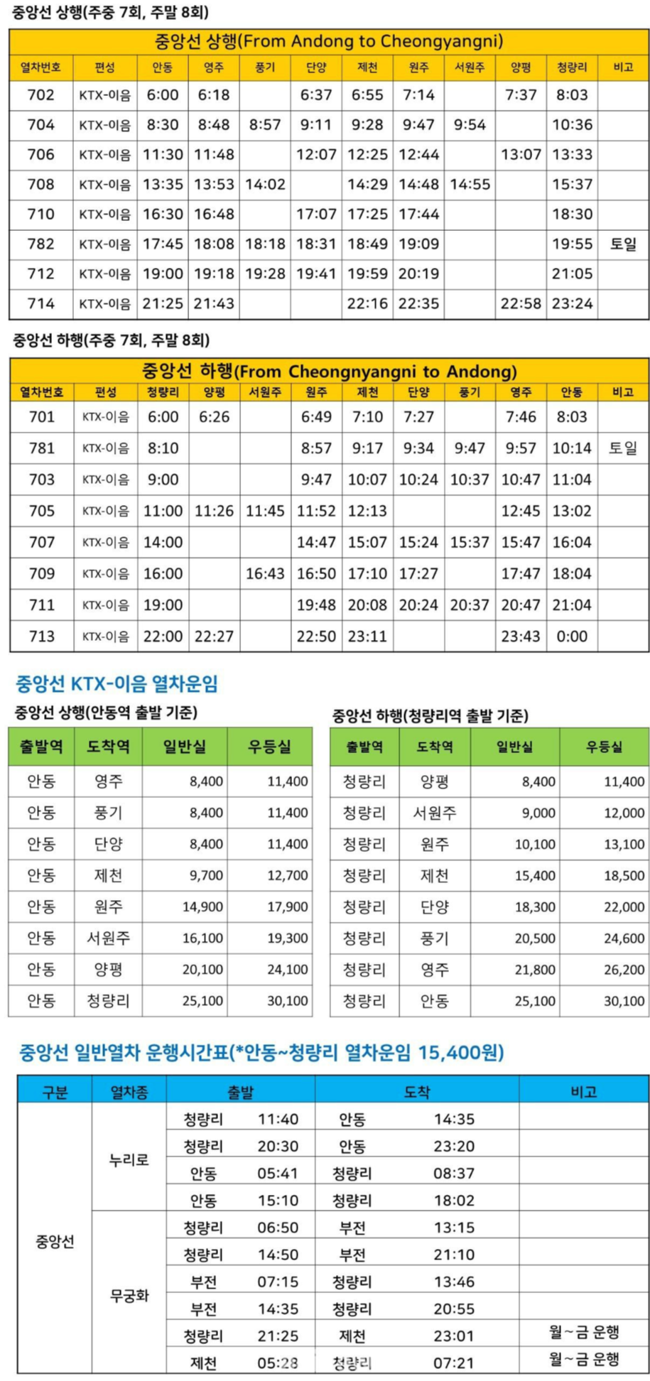 청량리-안동 KTX요금 (2022년 말 개통까지 한시적금액)