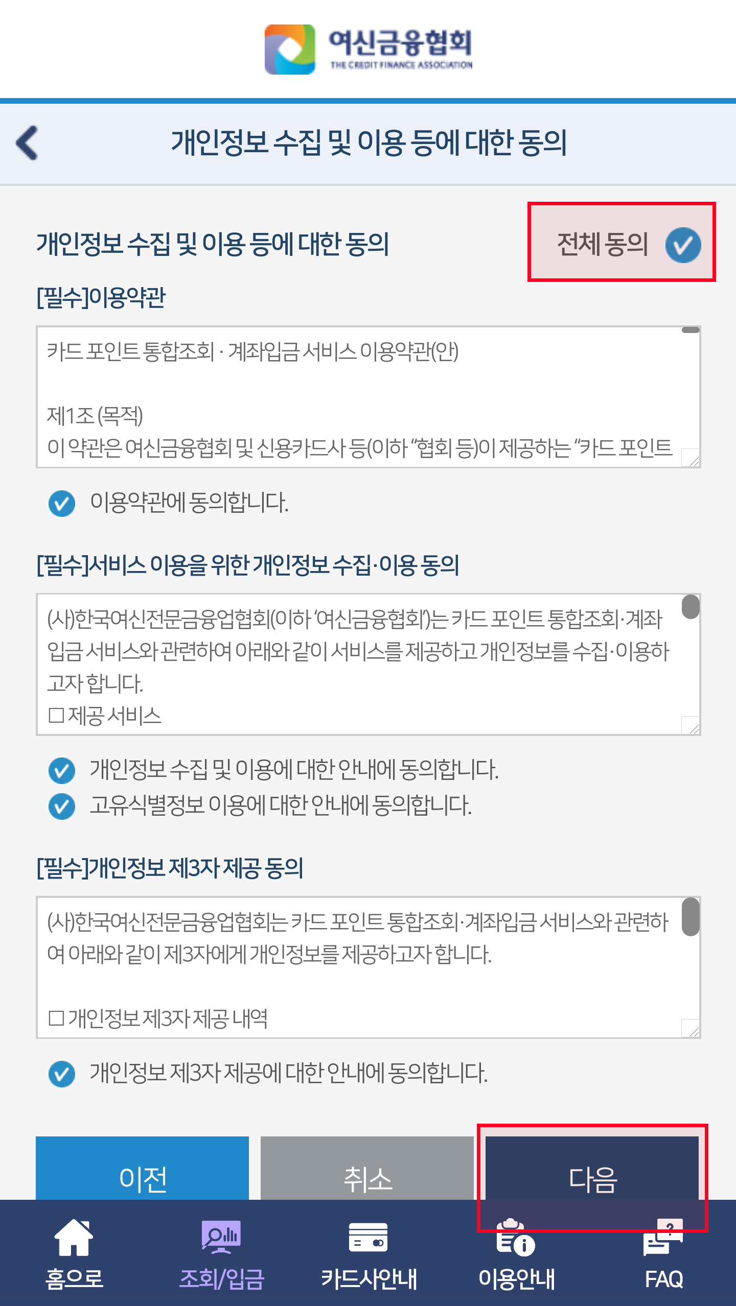 2. <통합조회&계좌입금> 메뉴를 선택 후 개인정보 수집에 전체동의 체크 후 하단에 다음을 클릭합니다.