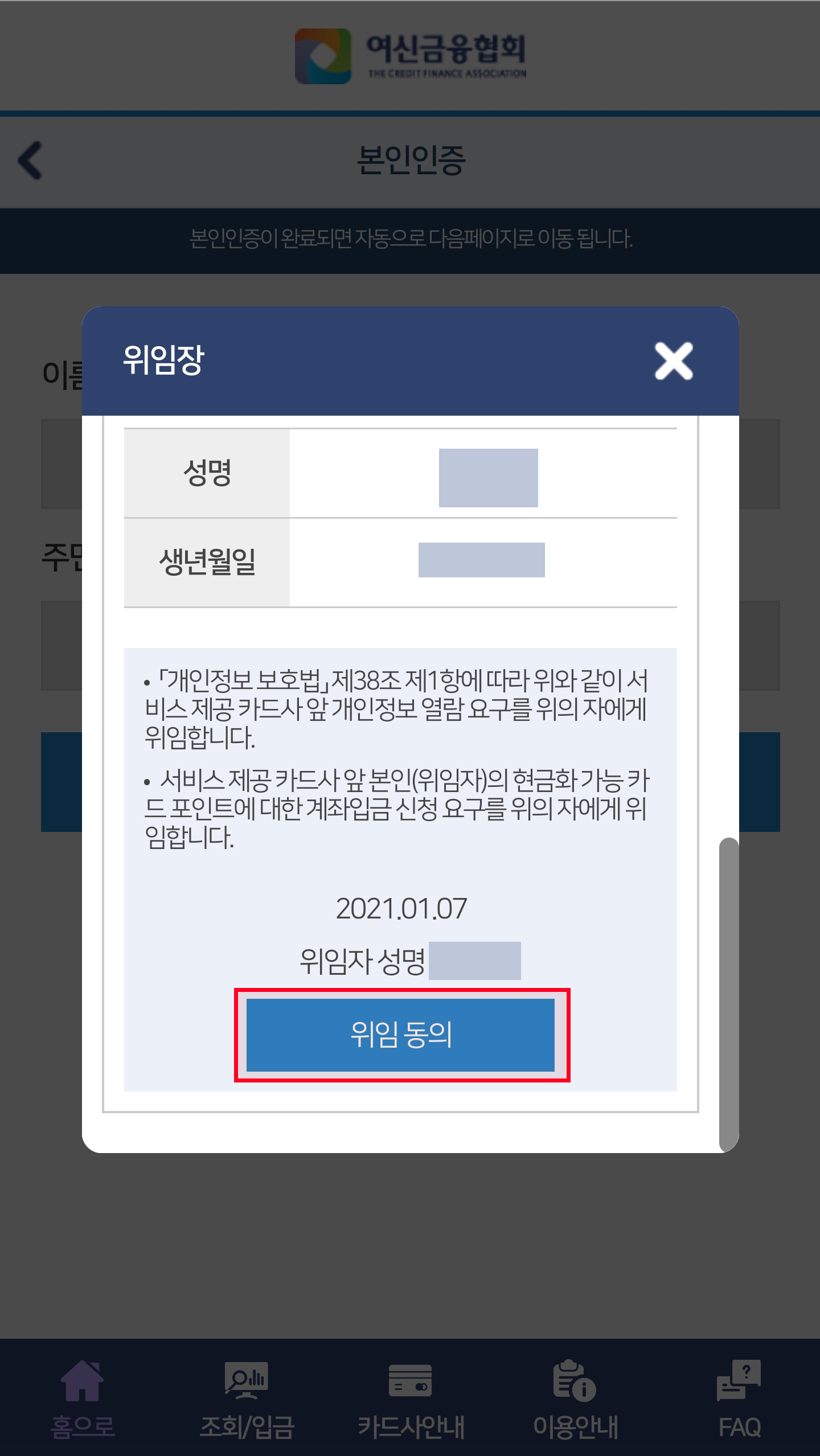 4. 본인인증이 완료되면 위임장에 <위임동의>를 클릭하고 주민번호 뒷자리를 입력하여 조회를 누릅니다.