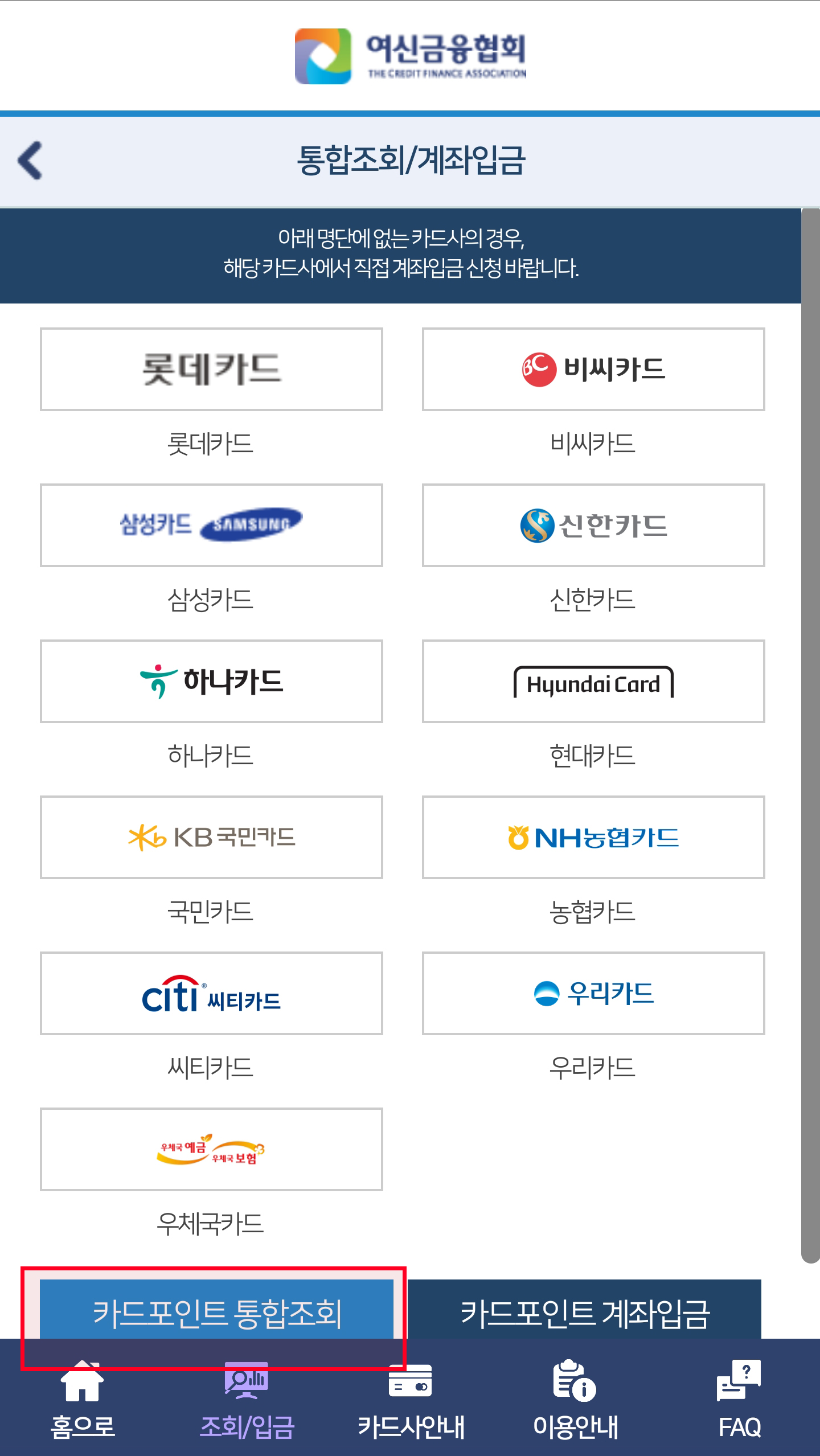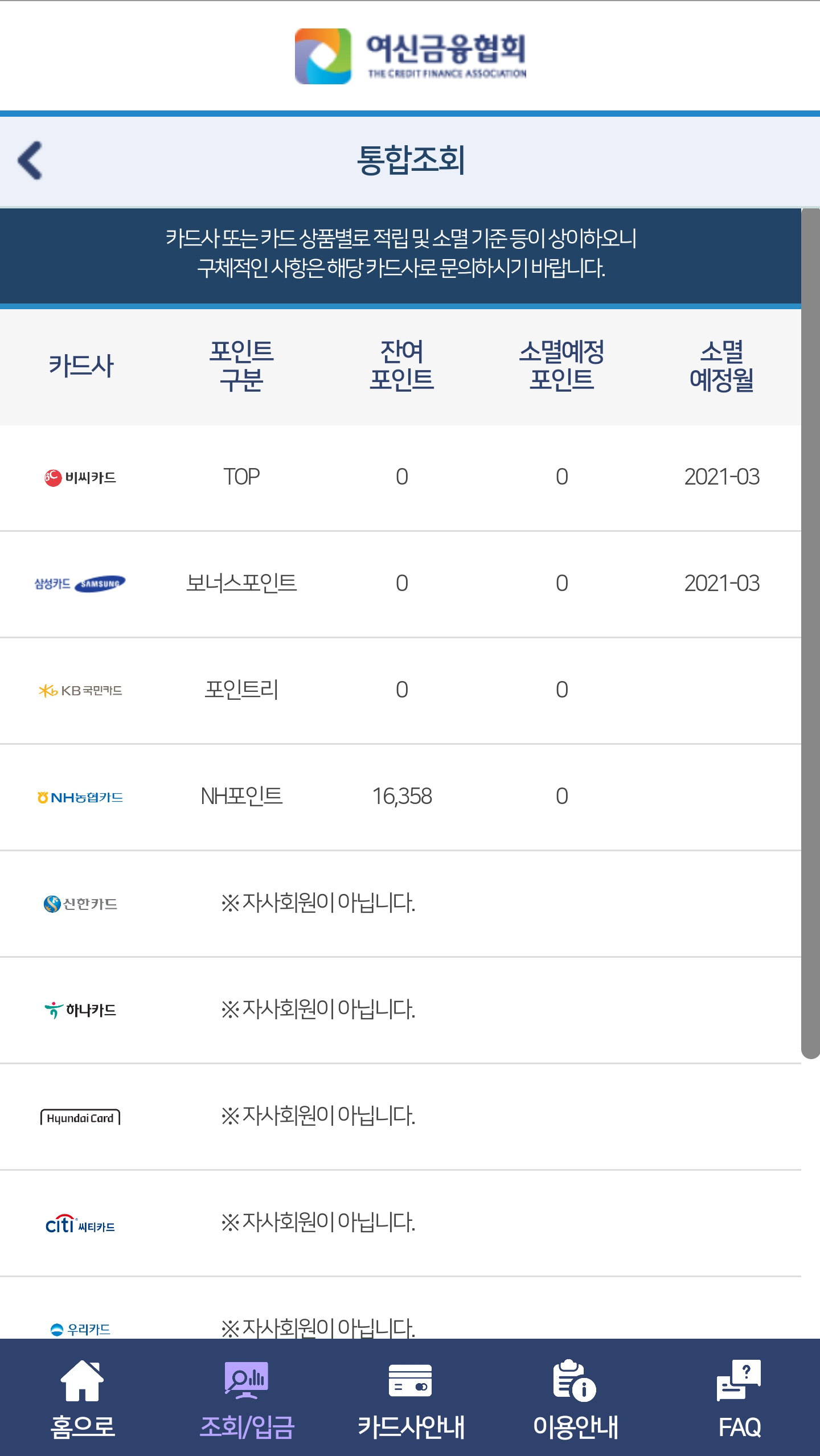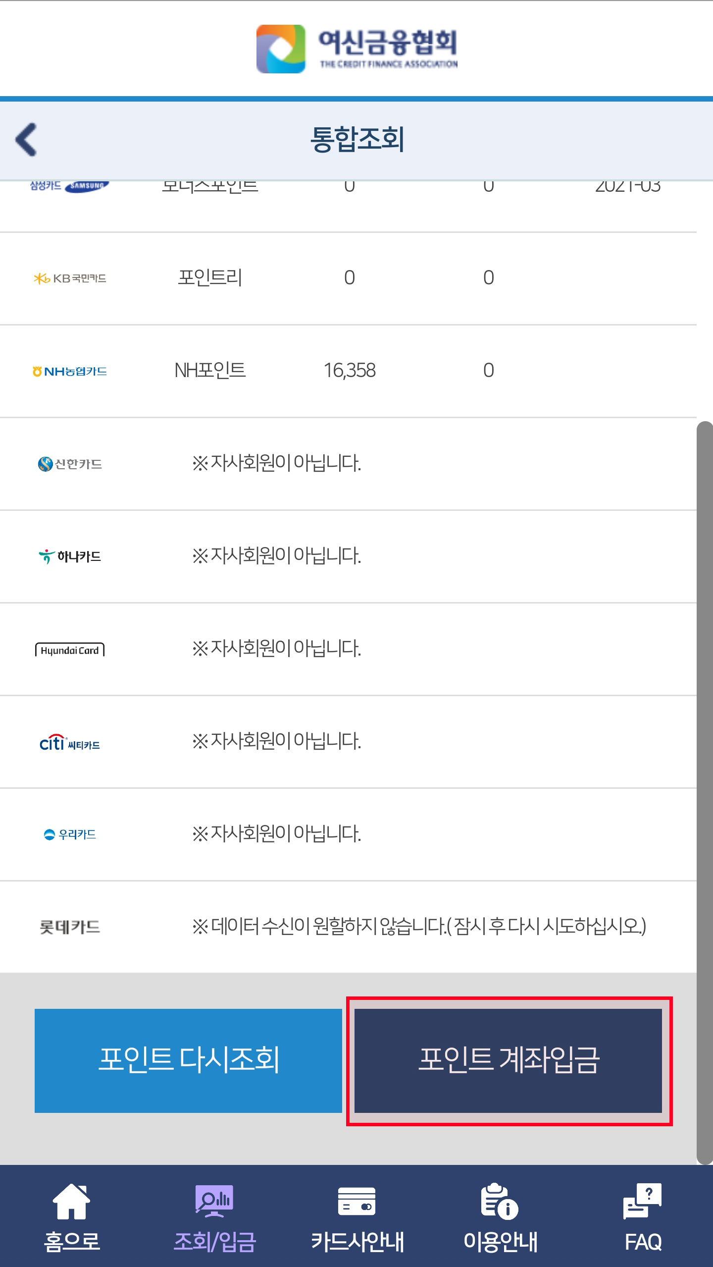 5. <카드포인트 통합조회>를 누르면 카드사별 잔여 포인트를 확인할 수 있습니다.