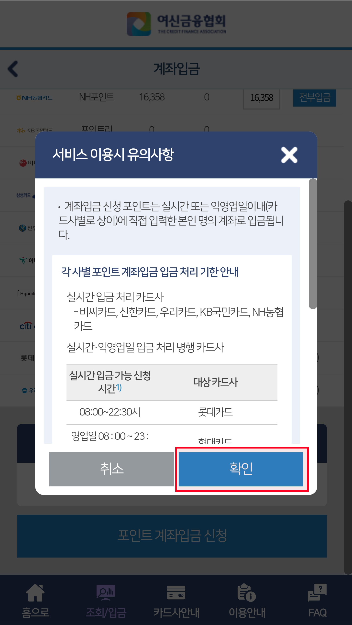 7. 입금요청 포인트를 다 적고 하단의 <포인트 계좌입금 신청>을 클릭하면 서비스 이용시 유의사항에서 확인을 눌러줍니다.