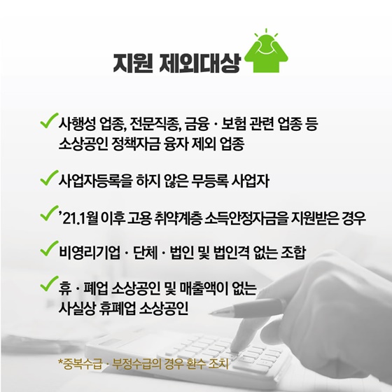 - 1인 1사업체 : 여러 사업체 운영하는 경우 1개 사업체만 지급