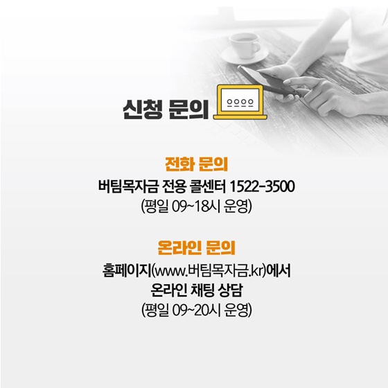 - 온라인 문의: 홈페이지(버팀목자금.kr)에서 온라인 채팅 상담 (평일 09~20시 운영)