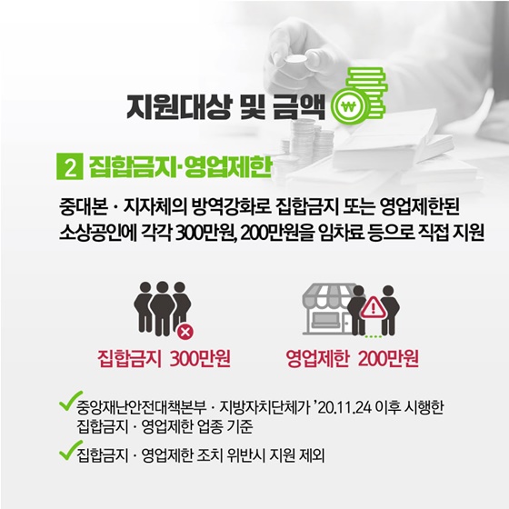 중대본ㆍ지자체의 방역강화로 집합금지 또는 영업제한된 소상공인에 각각 300만원, 200만원을 임차료 등으로 직접 지원