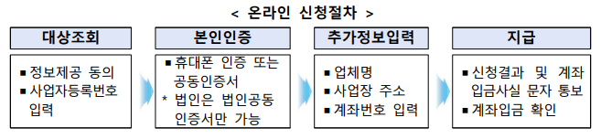 - 대표자 본인 직접 신청(본인 명의 휴대폰, 통장 계좌 등 필요)