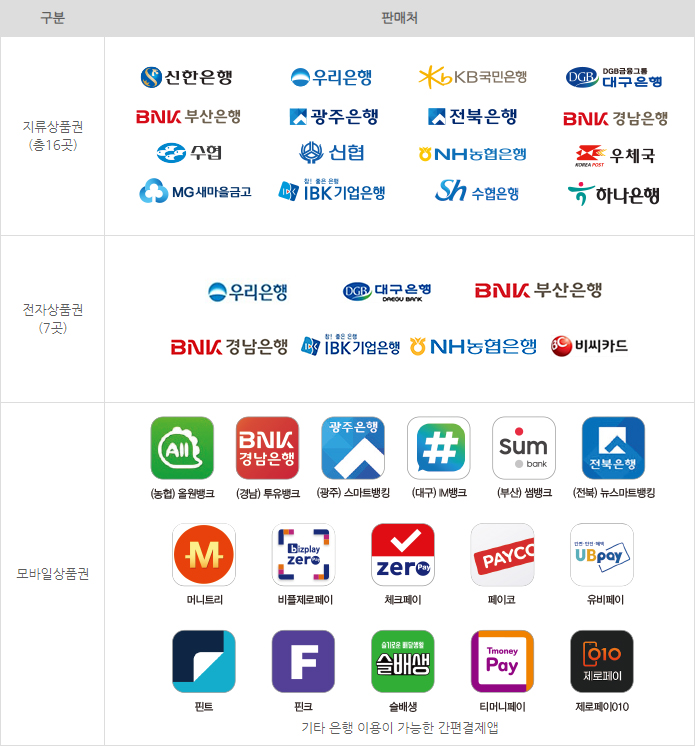 농협은행, 경남은행, 광주은행 등 6개 은행 앱과 티머니 등 10개 간편결제 앱에서 구입할 수 있습니다.