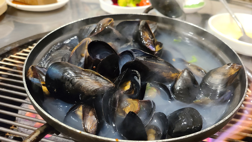 불판 위 조개 한 상.