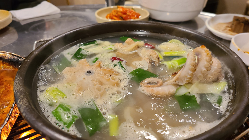 밑반찬과 홍합탕이 먼저 나오고