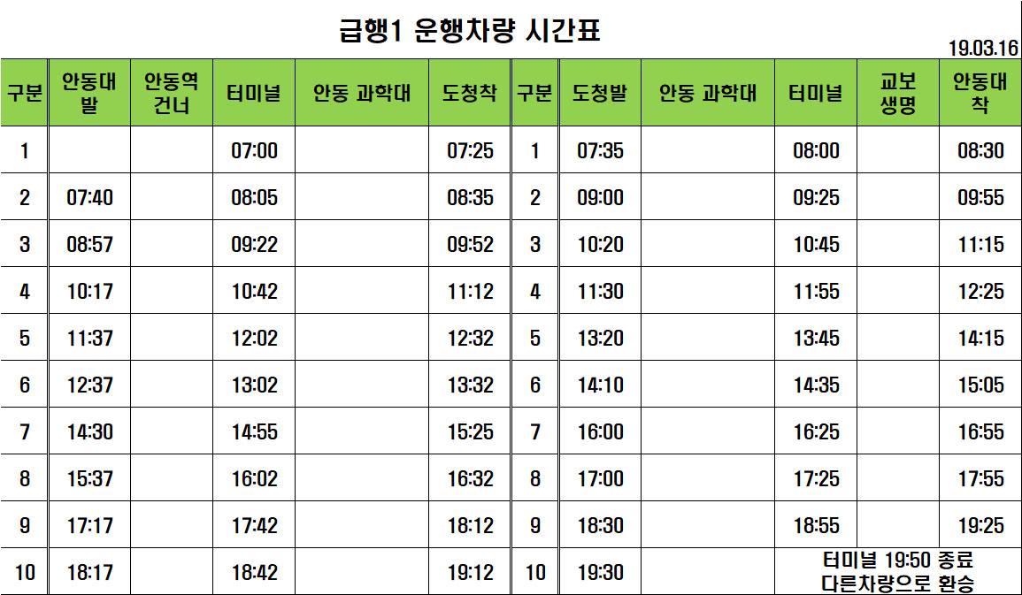 2019년 3월 16일 자 안동버스 회사에서 운영하는 급행 1의 시간표는