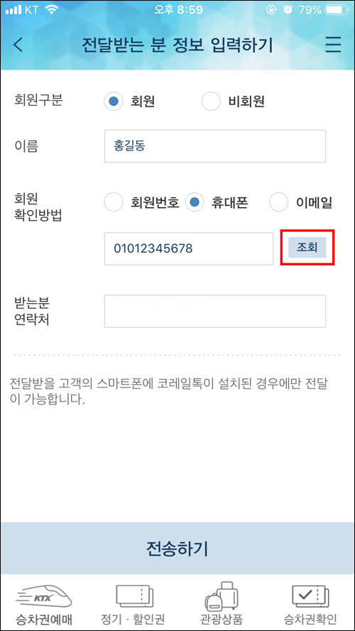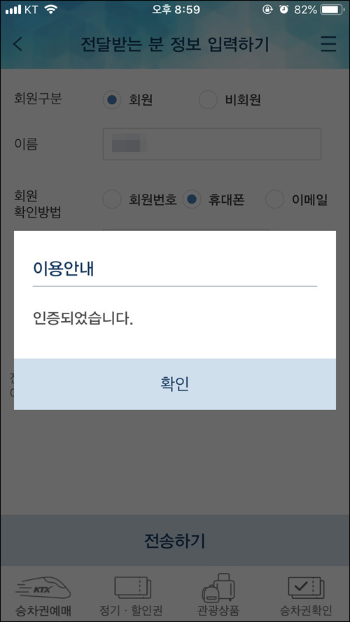 승차권을 전달받는 상대방이 코레일 회원임이 인증되었다.