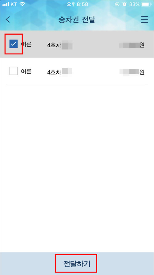 보내고자 하는 승차권 이미지 아래에 전달하기 선택