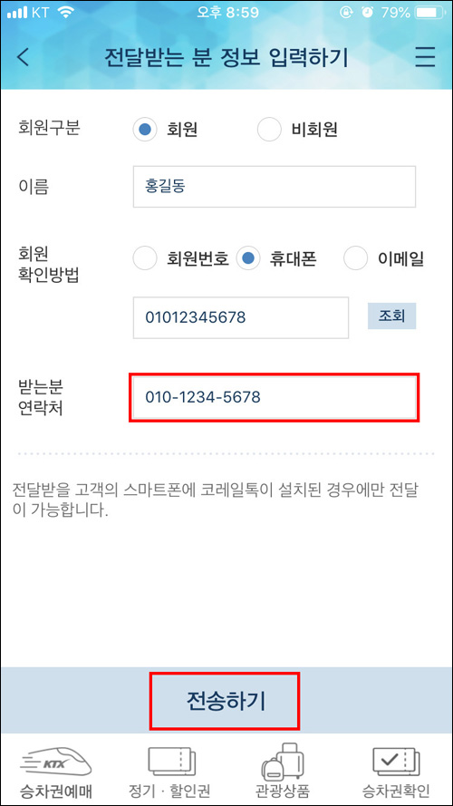 승차권을 전달받는 상대방이 코레일 회원임이 인증되었다.