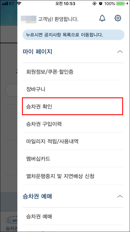 코레일톡 어플을 열어 메뉴 > 마이페이지 > 승차권확인 선택