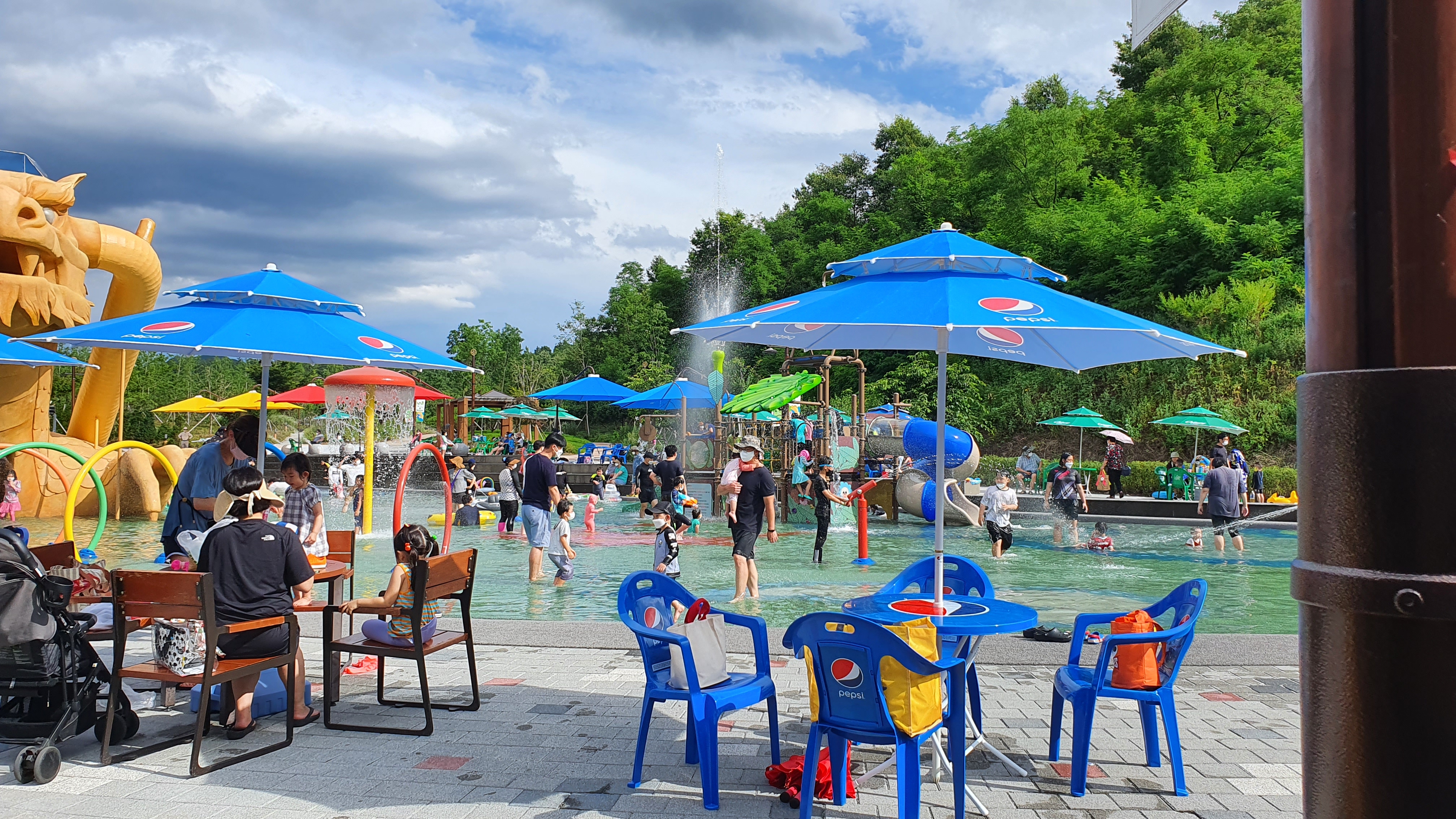 수영장 가쪽으로 설치된 파라솔테이블과 의자는