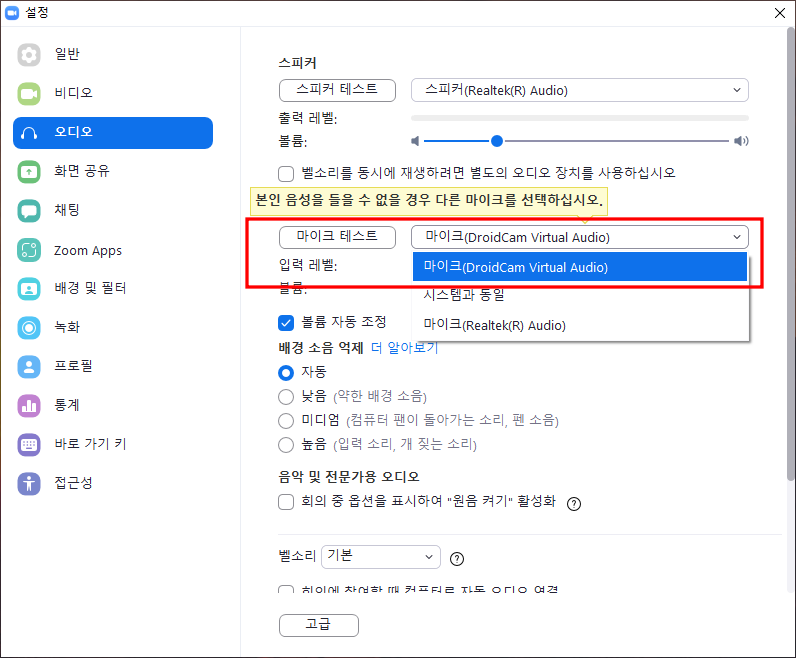3. 오디오 설정에서 마이크를 DroidCam Virtual Audio으로 선택