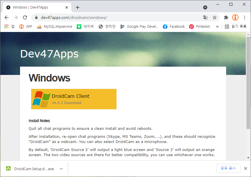 여기서 한번 더 Windows [DroidCam Client Download]를 클릭해야 다운로드가 진행된다.