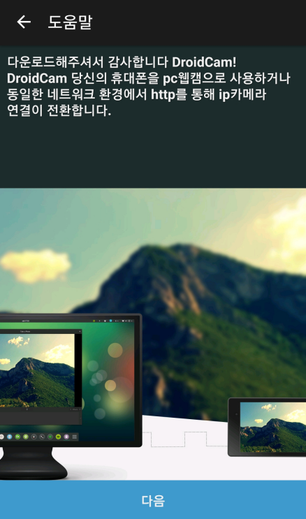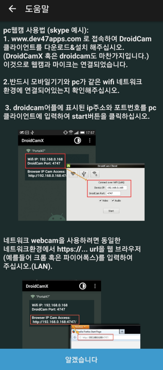 설치 후 DriodCam을 처음 실행하면 도움말 화면이 한글로 표시되면서 같은 WiFi 네트워크 연결방법이 쉽게 설명되어 있다. 어찌나 친절한지 ㅎ