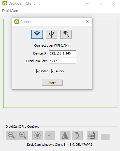 DroidCam은 다양한 방법의 접속형태를 지원해주고 있다.