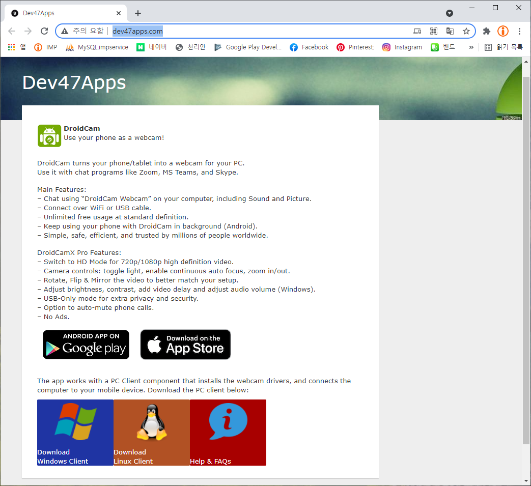 사용된 소프트웨어는 Dev47Apps 에서 개발된 DroidCam이다. 무료와 유료 버전이 있지만 여기선 무료를 이용해서 설치해보았다. PC용은 무료 버전, 스마트폰용 어플은 무료와 유료 버전이 있다. 유료 버전 설명은 하단에 있으니 참고하면 된다.